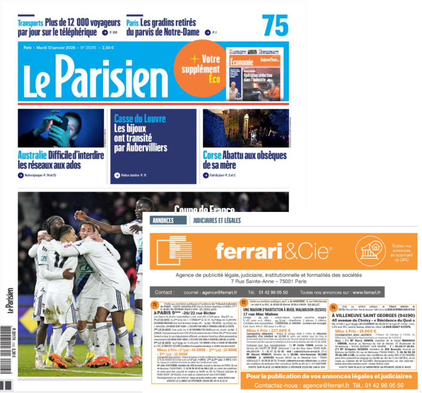 Premier titre de presse quotidienne régionale, Le Parisien est le seul journal habilité à la publication d’annonces légales sur tous les départements d’Île-de-France et dans l’Oise.